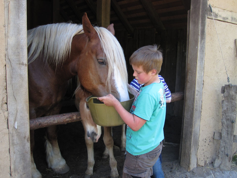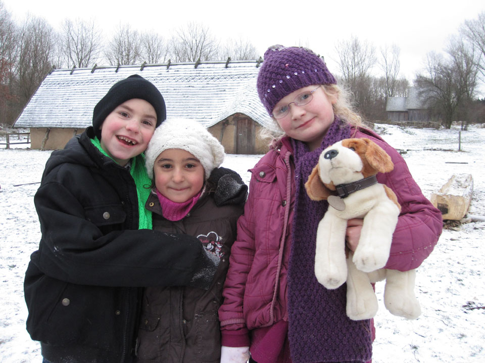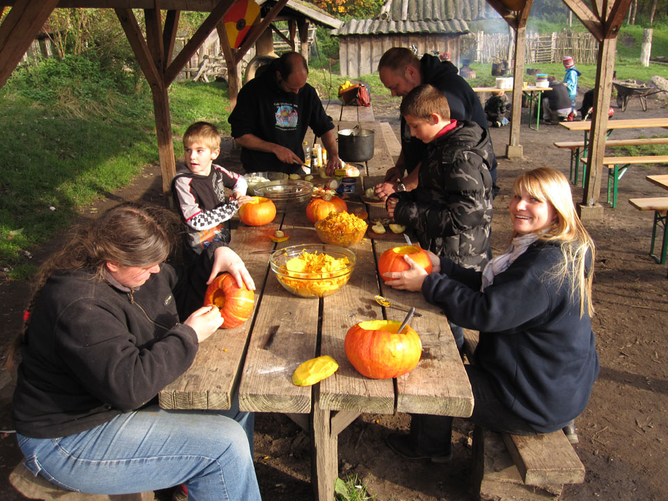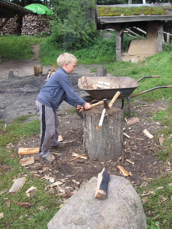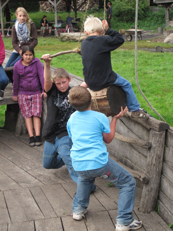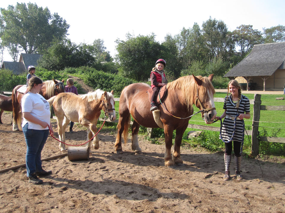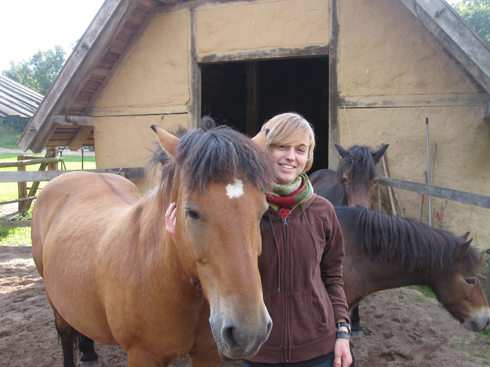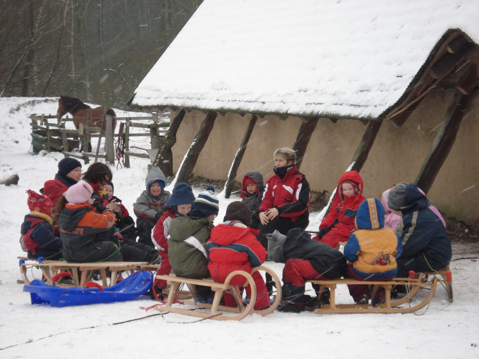 Ein typischer Tag im Geschichtserlebnisraum: morgens früh werden die Pferde gefüttert. Im Winter ist es dann noch dunkel… um 7:30 Uhr kommen dann die Erzieherinnen der Wikinger-KiTa-Gruppe und die ersten kleinen Wikinger trudeln ein. Inzwischen spazieren die ersten Nachbarn mit ihren Hunden über den Platz und um die weitläufigen Waldweiden. Während die Kinder spielen und toben kommt eine Schulklasse auf den Platz. Die Klasse verbringt den Vormittag bei uns, macht mit Feuerstein und -schläger ein großes Feuer und zieht danach einen unserer Mitarbeiter wie Heinrich der Löwe an. Der setzt sich dann auf eines unserer „Ritterpferde“. Nachdem die kleinen Wikinger und die Schulklasse gegangen sind, besprechen die Mitarbeiter, was am Tag anliegt. Die ersten Kinder und Jugendlichen der Ganztagsschule und Besucher des offenen Angebots kommen. Nun kümmern sich erstmal einige um die Tiere, füttern und streicheln sie. Nachmittags machen wir so viele unterschiedliche Dinge: Feuer machen, schnitzen, historische Häuser nachbauen, den Platz aufräumen und Dinge reparieren, zusammen Kubb spielen, Bogen schießen, filzen, spinnen, Holz hacken, malen, nähen, spazieren gehen, reiten, Kutsche fahren, mit den Ziegen Kunststücke üben, Stockbrot machen und kokeln und noch viel mehr, wozu die Kinder Lust haben. Abends versorgen wir dann wieder zusammen die Tiere. Die Schafe und Ziegen kommen in den Stall, die Zehntscheune und dann warten noch die Pferde auf ihr Futter. Manchmal übernachten wir und verschiedene Schulklasen oder Gruppen sogar hier in unseren historischen Häusern und machen dann noch eine Nachtwanderung…
