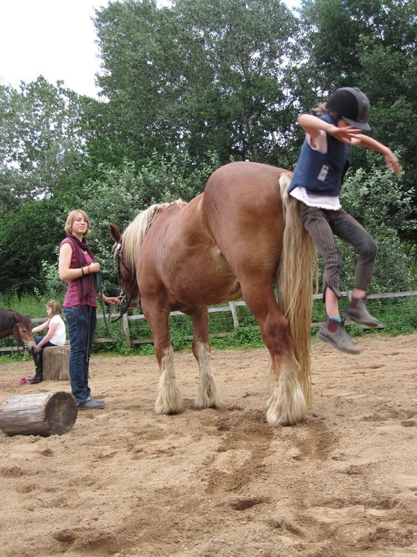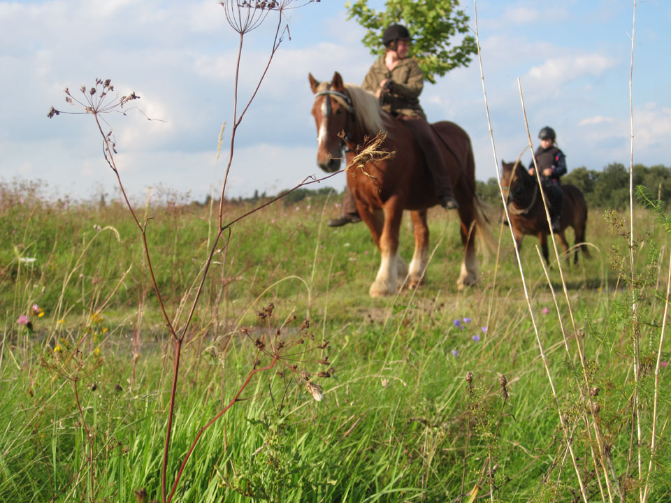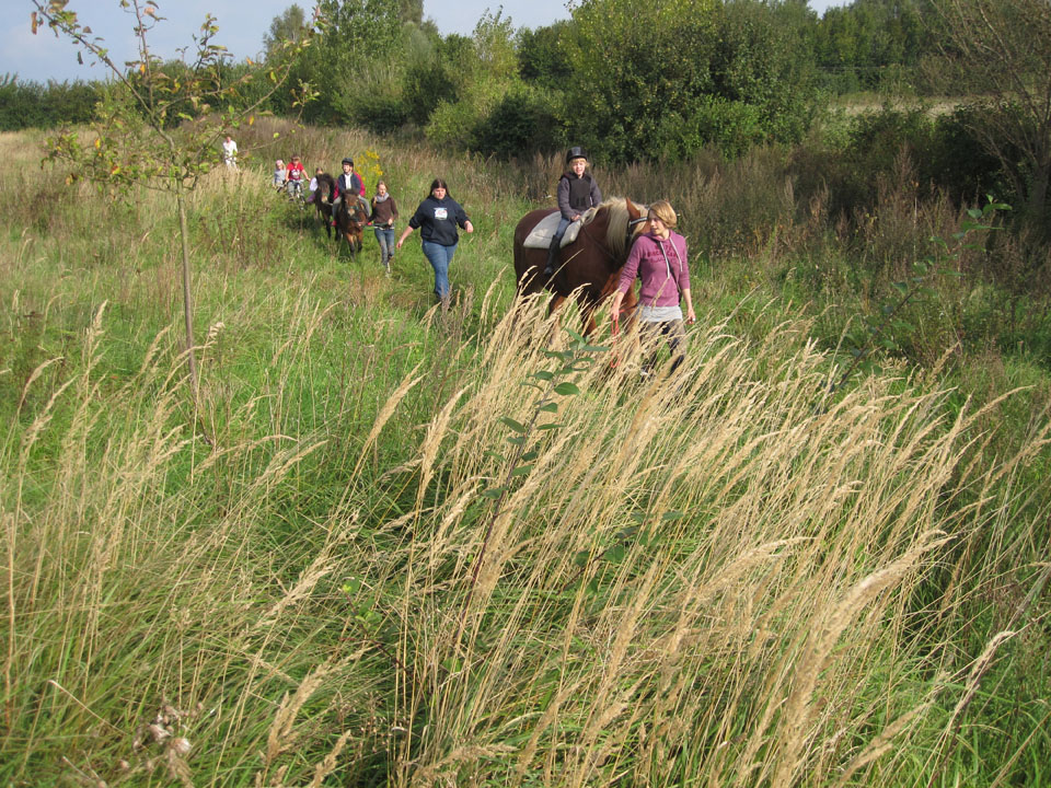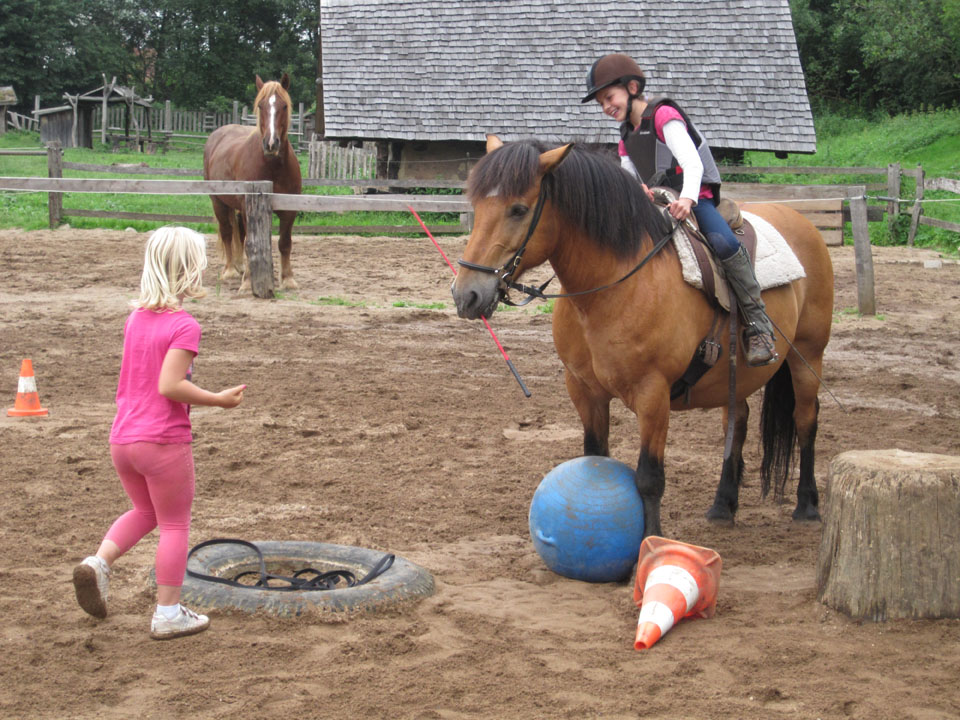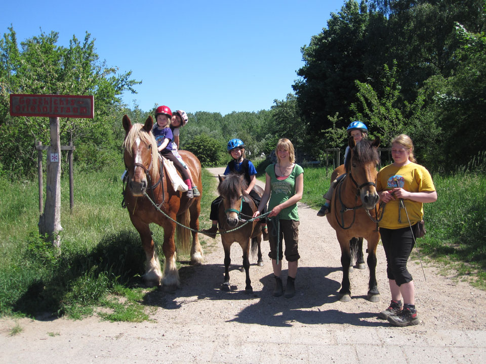 Eine große Bedeutung innerhalb der pädagogischen Arbeit mit Pferden hat das Reiten für junge Menschen mit und ohne Behinderungen vor dem Hintergrund des therapeutischen Reitens. Eine wichtige Grundlage für den vertrauens- und respektvollen Umgang zwischen Pferd und Mensch stellt die Bodenarbeit auf Grundlage des Natural-Horsemanship dar. Sie ist die Basis der Pferdeausbildung und Ausbildung der jungen Menschen am Pferd. Innerhalb der Einheiten des Reitens ist es elementar, den Pferden in ihrem annähernd natürlichen Lebensraum zu begegnen, sie gemeinsam von der Weide zu holen, sie zu putzen und zu versorgen. Die Reitstunden finden in enger Betreuung statt und neben der Arbeit an der Longe und in der Bahn sind Ausritte wesentlicher Inhalt. Die Reitweise orientiert sich an der leichten französischen Reitweise nach Philippe Karl.
